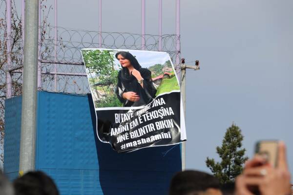 Kutlamaların yapılacağı alana mor ve siyah balonlar ile İran’da katledilen Jina Mahsa Amini ve Kemal Kurkut’un fotoğraflarının bulunduğu dev pankartlar asıldı.