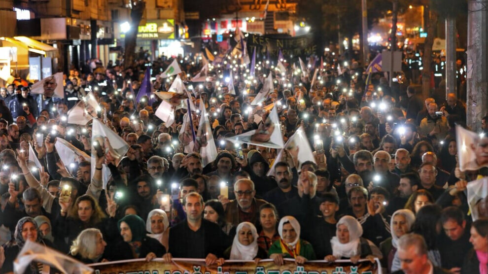 "Hakikat ışığı ile özgürlüğe yürüyoruz" pankartının açıldığı yürüyüşte binler, telefon ışıklarını açarak "Güneşimizi karartamazsınız" dedi. Yol boyunca esnaf ve evlerindeki yurttaşlar balkonlara çıkarak eylemcilere destek verdi. Amed sokakları, "Biji Serok Apo", "Bi can bi xwîn em bi te re ne ey Serok Apo", "Selam selam İmralı’ya bin selam" sloganlarıyla yankılandı.