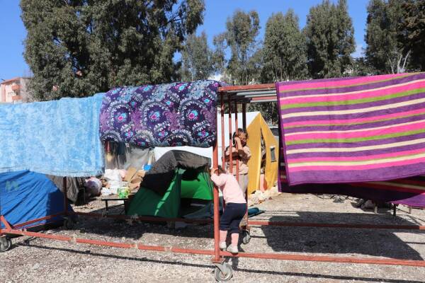 Antakya’da iki gündür kentte yağan yağmur ve etkili olan fırtına nedeniyle depremzedeler geceleri ıslak zeminde uyumak zorunda kalıyor.
