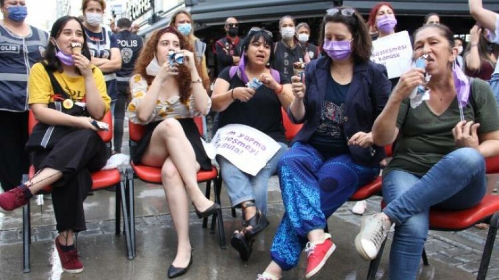 İzmir’de İstanbul Sözleşmesi’nin feshine karşı yapılan eylemde kadınlar Cumhurbaşkanı Tayyip Erdoğan’ı sandalyede bacak bacak üstüne atıp dondurma yiyerek, protesto etti. Kadınlar ayrıca “Katledilen kadınlar isyanımızdır” dedi.