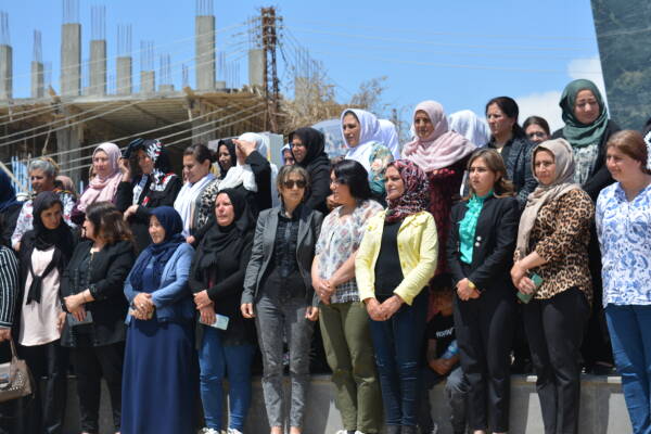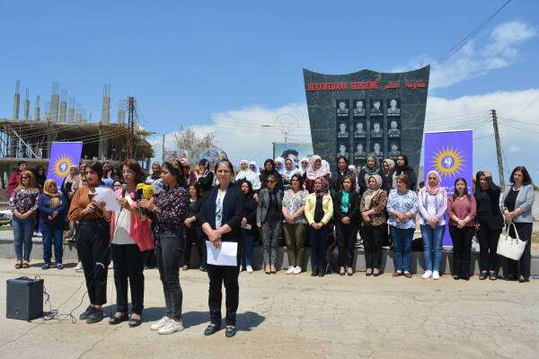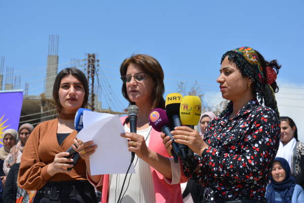 Qamişlo-  Son günlerde Türkiye Cumhurbaşkanı Recep Tayyip Erdoğan, bir milyon mültecinin kendi kontrolündeki Kuzey ve Doğu Suriye’ye yerleştirme konusunu gündeme getirdi. Kuzey ve Doğu Suriye Kadın Örgüt ve Hareketlerinin Ortak Eylem Platformu, yaptıkları açıklama ile Türkiye’nin bir milyon mültecinin işgal bölgelerine yerleştirmek istenmesi planlarını kınadı. Qamişlo’daki Efrin dörtyolunda yapılan açıklamaya onlarca kişi katıldı. Basın metni Qamişlo Kantonu Kangra Star yöneticisi Ibtîsam El-Huseyn tarafından okundu.