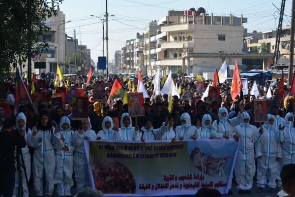 Cizîr Bölgesi'nden on binlerce kişi, Türk devletinin kimyasal silah kullanmasına tepki gösterirken, yürüyüşe katılan kadınlarda anti-kimyasal giysiler giydi.
