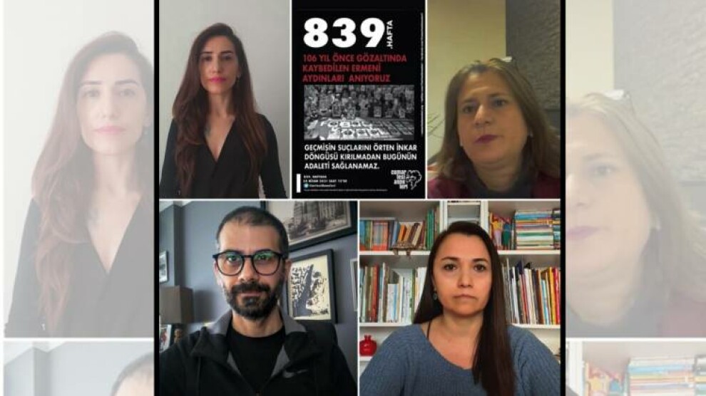 İstanbul – Gözaltında kaybedilen yakınlarının akıbetini sormak ve faillerin cezalandırılmasını talep etmek amacıyla Cumartesi Anneleri 839’uncu kez biraraya geldi. Annelerin eylemi pandemi nedeniyle online gerçekleştirildi. Bu haftaki eylemde, 106 yıl önce evlerinden gözaltına alınıp bir daha geri dönemeyen İstanbullu Ermeni aydınların akıbeti sorularak, faillerin cezalandırılması talep edildi.