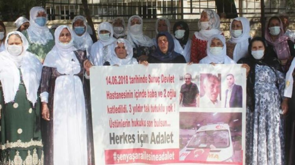 Riha - AKP Milletvekili İbrahim Halil Yıldız'ın koruma ve yakınlarının saldırısı sonucu eşi ve iki oğlunu yitiren Emine Şenyaşar ile saldırıdan yaralı kurtulan oğlu Ferit Şenyaşar’ın Urfa Adliyesi önündeki “Adalet” nöbeti sürerken, Şırnak Barış Anneleri Meclisi üyeleri, Tevgera Jinên Azad (TJA) aktivistleri ve HDP Şırnak ilçe örgütleri aileye ziyarette bulundu. HDP Cizre İlçe Eşbaşkanı Zilan Ecevit ile Silopi Eşbaşkanı Zozan Aşkın ve onlarca kadının yer aldığı heyet, “Adalet gelsin zulüm bitsin”, “Adalet istiyoruz” yazılı dövizler ile karşılandı.