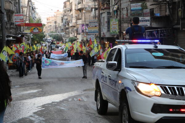 Halep – Suriye Devrimci Gençlik Hareketi (Tevgera Ciwanên Şoreşger), Kürt Lider Abdullah Öcalan'a yönelik tecridi kınamak için dün akşam saatlerinde Halep’in Şêxmeqsûd mahallesinde yürüyüş düzenledi. Mahallenin batısındaki toplantı salonundan başlayan yürüyüşe yüzlerce genç ve mahalle sakinleri katıldı. Yürüyüş, Şêxmeqsûd mahallesinin doğu Cibanat bölgesinde sonlandırıldı.