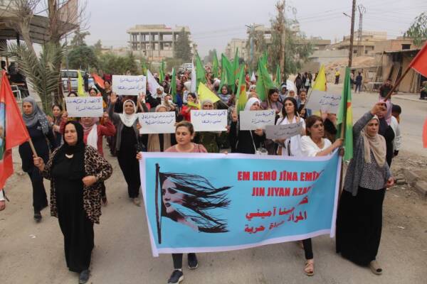 Hesekê- İran’ın başkenti Tahran’da Evin Cezaevi’nde çıkan yangın ve tutsaklara yönelik saldırıları sonucunda 8 tutuklu yaşamını yitirdi 61 tutuklu ise yaralandı. Bugün Haseke'de toplanan kadınlar, Evin Cezaevi'ne yönelik saldırıları ve İran rejiminin kadınlara ve halka yönelik eylemlerini toplu bir yürüyüşle kınadı. Yürüyüş kısa sürede mitinge dönüştü.
