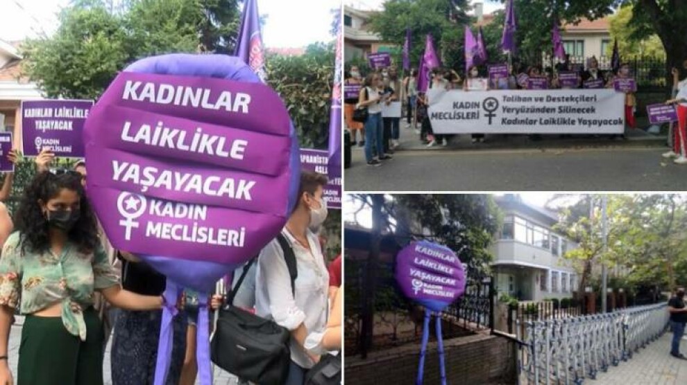 Beşiktaş’taki Afganistan Başkonsolosluğu’na mor çelenk bırakan kadınlar, “Taliban ve destekçileri yeryüzünden silinecek, kadınlar laiklikle yaşayacak” yazılı pankart açtı.