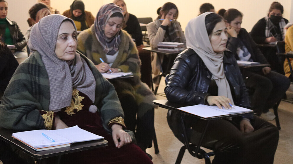 Kobanê- Kuzey ve Doğu Suriye’deki Arap halkından olan kadınlar, Kürt Halk Önderi Abdullah Öcalan’ın Kürt sorununun çözümü ve bölgede barışın sağlanması için sunduğu Barış ve Demokratik Toplum Manifestosu doğrultusunda eğitim alıyor. Kongra Star öncülüğünde yürütülen program kapsamında, Fırat Kantonu’na bağlı Kobanê şehrinde Şehid Şîlan Akademisi’nde 31 kadının katılımıyla eğitim programı başlatıldı. 1 Aralık’ta başlayan programda, eğitimin önemi, kültür ve ahlak, öz savunma, Kürdistan tarihi, Önderlik gerçeği ve kadın tarihi, Jineolojî, Suriye tarihi, Kuzey ve Doğu Suriye Devrimi, eşit ve katılımcı yaşam, toplumsal adalet, devrimci halk savaşı ve toplumsal sözleşme konularında eğitim verildi.