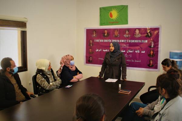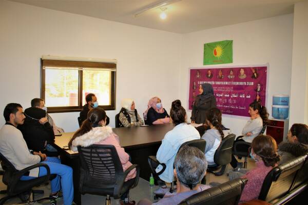 Hesekê - Kongra Star’ın 25 Kasım Kadına Yönelik Şiddete Karşı Uluslararası Mücadele Günü vesilesiyle Kuzey ve Doğu Suriye'deki kadın hareketleri ve örgütlerine yönelik 12 Kasım'da ‘Ortak Faaliyet Platformu’ adıyla başlattığı etkinlikler devem ediyor. “Her türlü erk devlet ve erk zihniyete karşı: Jin, jiyan, azadi” sloganıyla devam eden etkinliklerde bugün Kongra Star ilçedeki Şehit Lêgerîn Hastanesi doktor ve hemşirelerine seminer verdi.