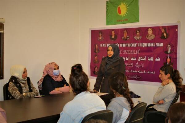 Seminer bir dakikalık saygı duruşuyla başladı. Ardından Kongra Star Eğitim Komitesi Üyesi Mûfîda Şêx Salih, kadına yönelik şiddete dikkati çekerek şöyle konuştu: “Şiddetin birçok çeşidi var. Şiddet sadece dayakla sınırlı değil. Psikolojik şiddet de birçok hastalığı beraberinde getiriyor. Namus adı altında kadına yönelik birçok suç işleniyor, bu yüzden toplumumuz bilinçli ve bilgi düzeyi yüksek olmalıdır. Kadınlar da şiddeti kabul etmemeli ve buna karşı mücadele etmelidir. Bu konuda önemli olan şey ise her iki cins arasında eşitliğin sağlanmasıdır."