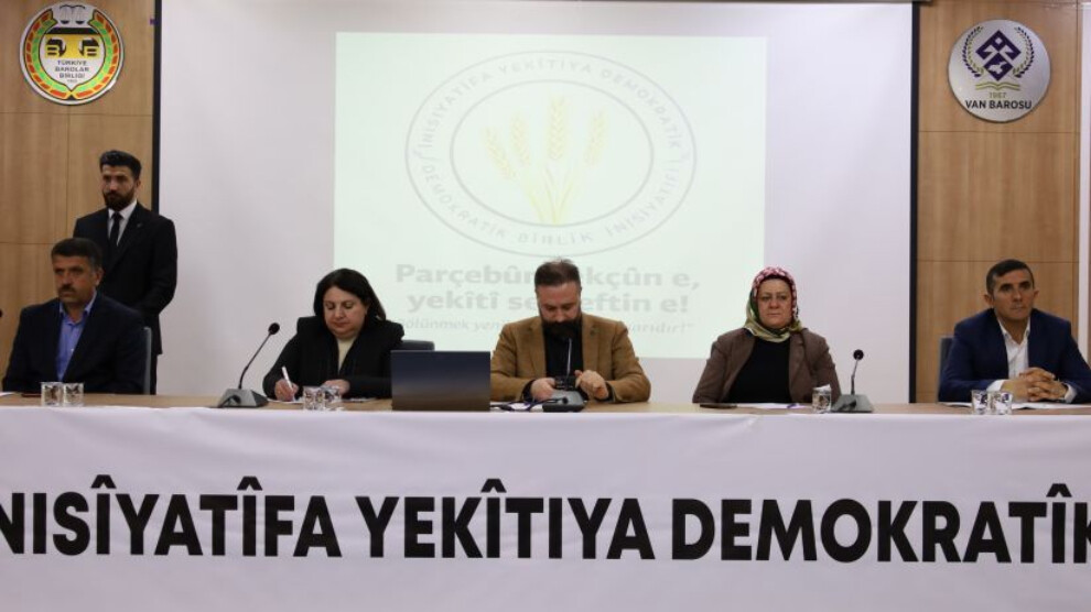 Wan Barosu Tahir Elçi Konferans Salonu’nda düzenlenen toplantıya çok sayıda kişi katıldı. Saygı duruşunun ardından Demokratik Birlik İnisiyatifi Eşsözcüleri Gülcan Kaçmaz Sayyiğit ile Mehmet Kamaç konuşma yaptı.