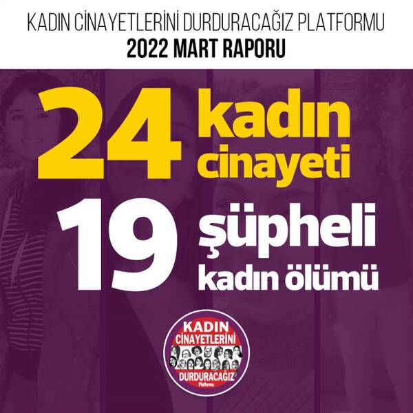 Haber Merkezi - Kadın Cinayetlerini Durduracağız Platformu (KCDP), aylık olarak hazırladığı kadın cinayetleri raporunu yayımladı. 2022 Mart ayı raporuna göre erkekler 24 kadını öldürdü. Şüpheli kadın ölümleri de bu ay devam etti; 19 kadının ölümü kayıtlara şüpheli olarak geçti.