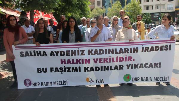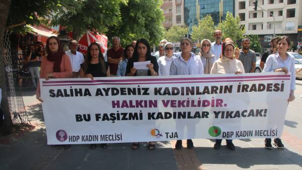 Batman’da Özgür Kadın Haraketi (Tevgera Jinên Azad -TJA), Demokratik Bölgeler Partisi (DBP) ve Halkların Demokratik Partisi (HDP) Kadın Meclisi, DBP Eş Genel Başkanı Saliha Aydeniz’in dokunulmazlığının kaldırılmasına ilişkin Meclis Hazırlık Komisyonu’nun aldığı kararı protesto etmek amacıyla HDP Batman İl Örgütü Binası önünde buluştu. “Saliha Aydeniz kadınların iradesi, halkın vekilidir. Bu faşizmi kadınlar yıkacak” pankartının açıldığı açıklamada DBP PM Üyesi Nurten Üzümcü hazırlanan metni okudu.
