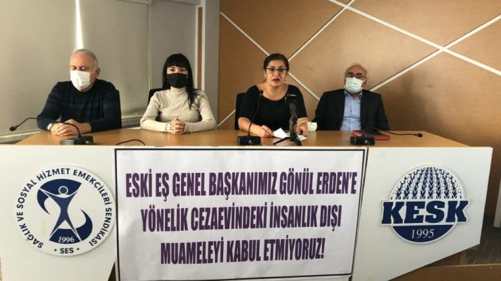 Ankara – Sağlık ve Sosyal Hizmet Emekçileri Sendikası (SES) Genel Merkezi, cezaevinde tutuklu bulunan SES önceki dönem Eş Genel Başkanı Gönül Erden’in yaşadığı hak ihlallerine ilişkin basın toplantısı düzenledi. Konu hakkında açıklamada bulunan SES Eş Genel Başkanı Selma Atabey, Gönül Erden’in tutuklandıktan sonra Ankara Sincan Kampüsü’nde bulunan L 3 Tipi Cezaevi’nde Covid-19 tedbirleri kapsamında 3 hafta karantinada kaldığını ve Covid-19 testinin negatif çıkması üzerine Sincan Kadın Kapalı Cezaevi’ne nakledildiğini belirtti.