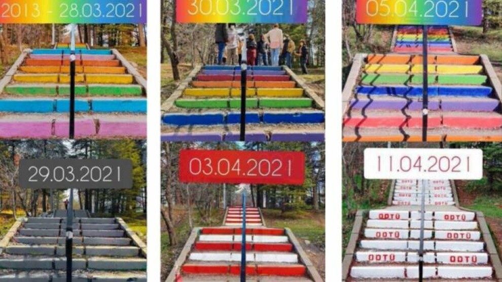 Haber Merkezi – Ortadoğu Teknik Üniversitesi (ODTÜ) öğrencileri, Gezi Direnişi zamanında renklendirdikleri kampüs merdivenleri, geçtiğimiz aylarda üniversite yönetimi tarafından griye boyanmış, olayı protesto eden öğrenciler merdivenleri yeniden gökkuşağı renklerine dönüştürmüştü. Öğrenciler tarafından yeniden renklendirilen kampüs merdivenleri, ODTÜ yönetimi tarafından bu sefer de beyaza boyanarak basamakların üzerine kırmızı renkli boya ile “ODTÜ” yazdırıldı. Bunun üzerine öğrenciler, kampüs merdivenlerini yeniden gökkuşağı renklerine boyayarak, basamaklar üzerine “Kayyumsuz ODTÜ” yazdı. Ardından rektörlük yeniden merdivenleri griye boyadı. ODTÜ'deki gökkuşağı merdivenleri 2 ayda 4 kez okul yönetimi tarafından boyandı.