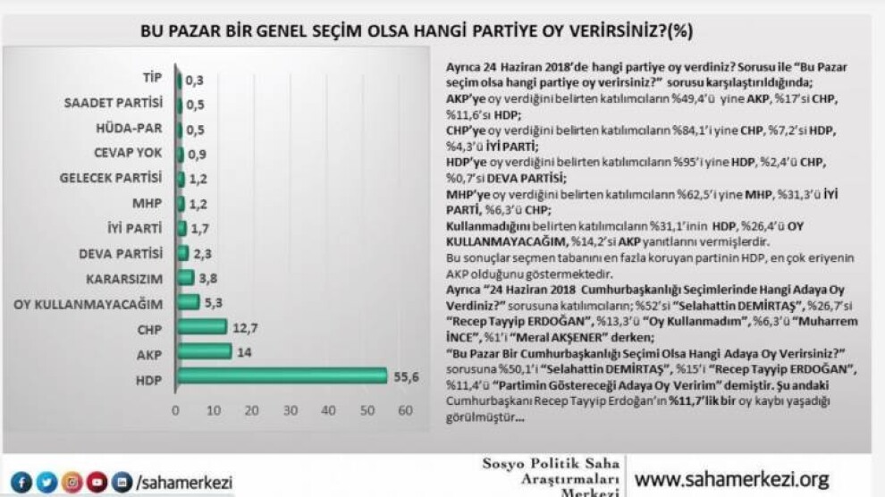 Saha araştırmasının çoğunluğunun gençlerden ve yüzde 75,5’inin düşük gelirli yurttaşlarla yapıldığı belirtildi. Çalışmaya katılanlara ilk olarak “Sizce Türkiye'nin En Önemli 1. Öncelikli Sorunu Nedir?” sorusunun yöneltildiği kaydedilirken, “Buna göre katılımcıların yüzde 74,7’si ‘Ekonomik Kriz/İşsizlik’, yüzde 14,2’si ‘Kürt Sorunu’, yüzde 2,5’i ‘Hukuk Sisteminin Mevcut Durumu’ demiştir” bilgisi paylaşıldı.