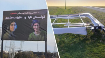 SİHA saldırısıyla katledilen Gülistan Tara ve Hêro Behadîn’in fotoğraflarının yer aldığı pano, tahrip edilerek yakıldı.