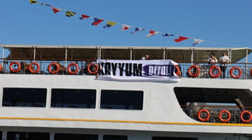 Colemêrg Belediyesi'ne kayyım atanmasını protesto eden HDK üyeleri, vapura "Kayyum defol" pankartı astı.
