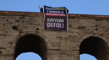 DEM Partili vekiller Bozdoğan Kemeri’ne kayyım pankartı astı